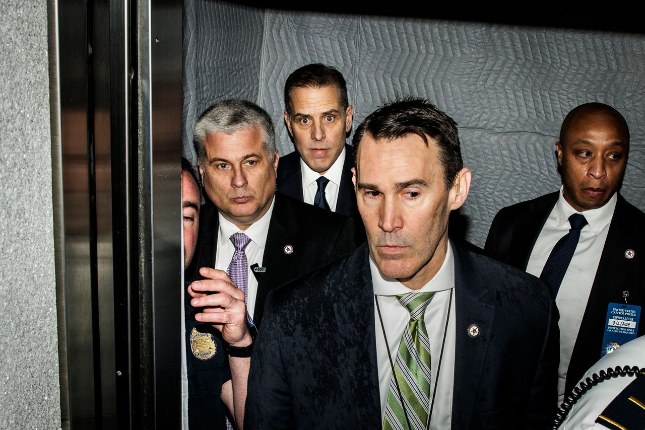 總統之子於上午10點聽證會開始前,乘坐兩輛SUV組成的車隊抵達奧尼爾眾議院辦公大樓。他在律師阿貝·洛厄爾陪同下冒雨前行,面對聚集的記者未發一言便進入會場。