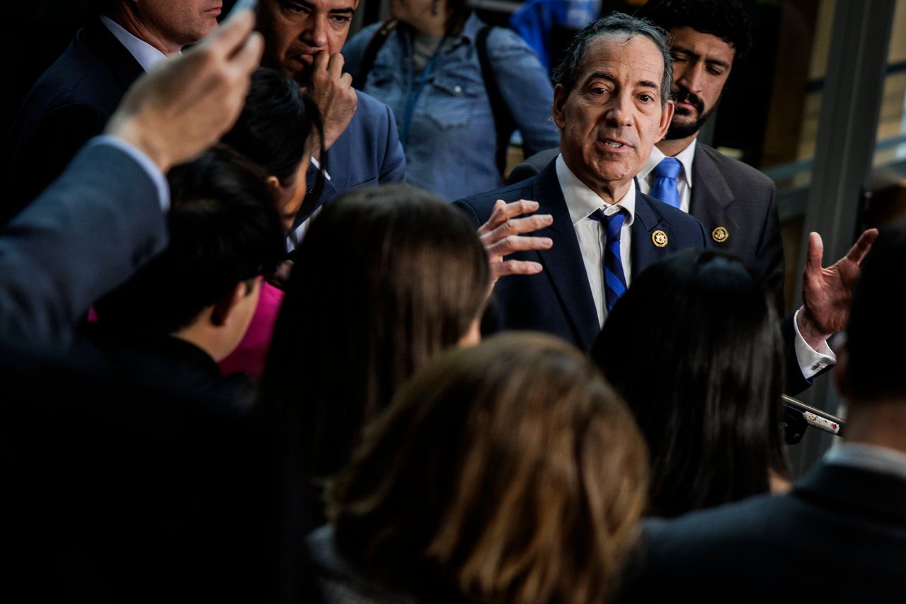 馬里蘭州民主黨眾議員傑米·拉斯金在週三聽證會休會期間接受記者採訪。圖片來源:塞繆爾·科魯姆/蓋蒂圖片社共和黨人則言辭謹慎,援引眾議院規則稱不得討論正在進行中的證詞。“進展順利,“眾議院司法委員會主席吉姆·喬丹(俄亥俄州共和黨)在午餐休會時表示。科默則調侃道:“我高興得要命。”