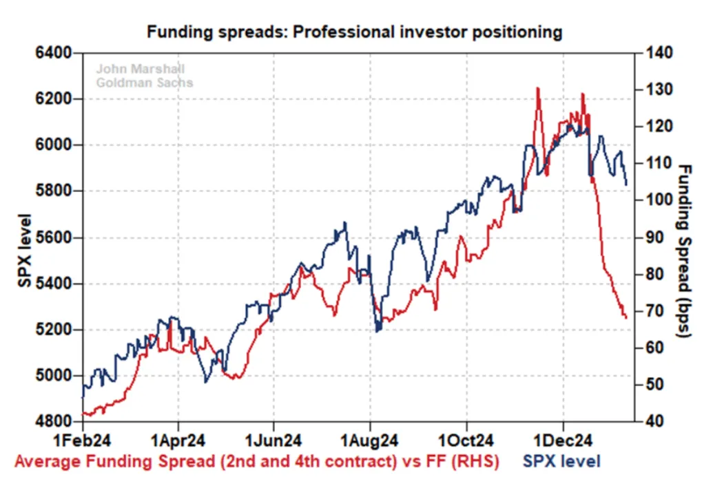 他們表示,資金利差——通過股票衍生品如掉期、期權和期貨進行長期敞口的需求衡量——已從去年12月底的約130個基點驟降至約70個基點。