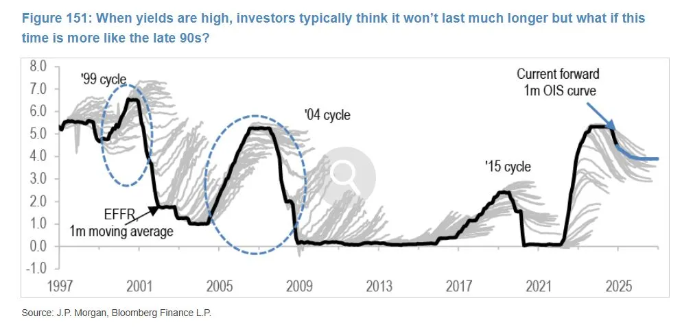 來源:摩根大通來源:摩根大通正如你所看到的,市場在預測變化時往往非常不耐煩。在2008年至2018年之間的十年裏,他們總是期待通貨膨脹的上升就在眼前(實際上,我們經歷了多年通貨緊縮和低利率)。然後,在2020年之後的幾年裏,通貨膨脹總是即將下降,經濟衰退只在一兩個月之內(相反,美聯儲被迫不斷提高利率——直到最近)。
