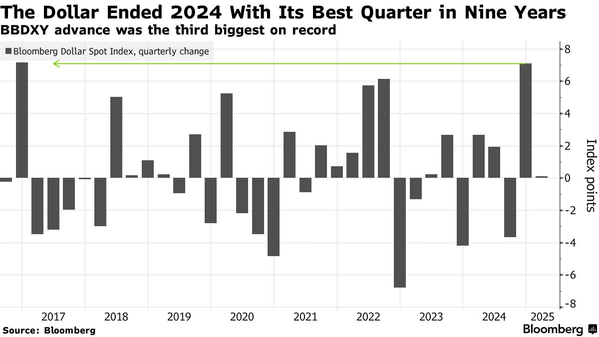 交易台在9月底到11月特朗普勝選期間,美元的貿易加權指數上漲了約5%。根據彭博社的計算,使用所謂的障礙期權押注美元對歐元升值的交易員,在此期間獲得了其名義投資金額的五倍回報。