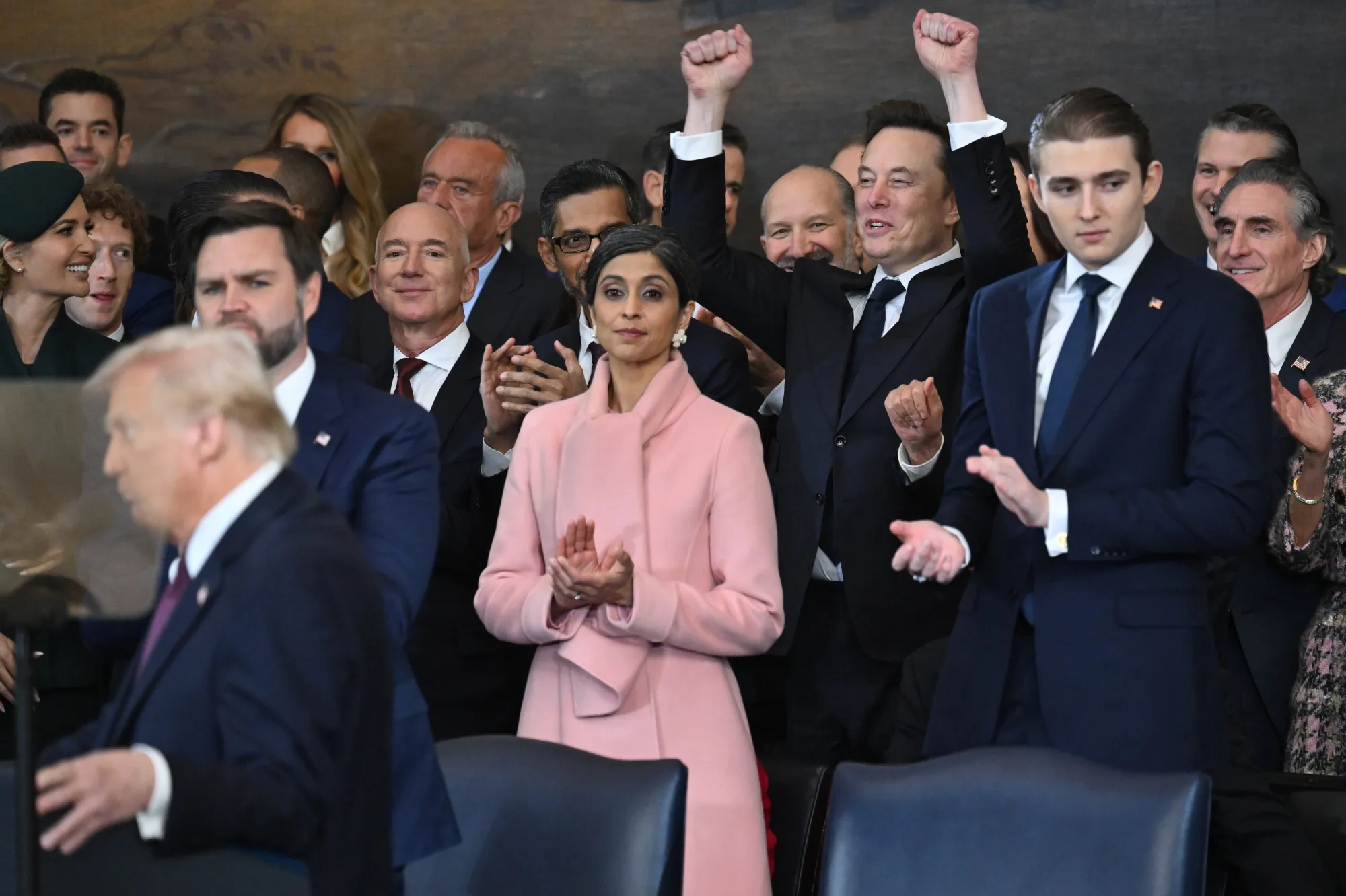 第二天,當特朗普在美國國會大廈宣誓就職時,面帶微笑的馬斯克坐在總統即將上任的內閣成員之前的優越位置。與傑夫·貝索斯和馬克·扎克伯格等億萬富翁並肩,科技巨頭們出現在無數次權力交接的直播鏡頭中。