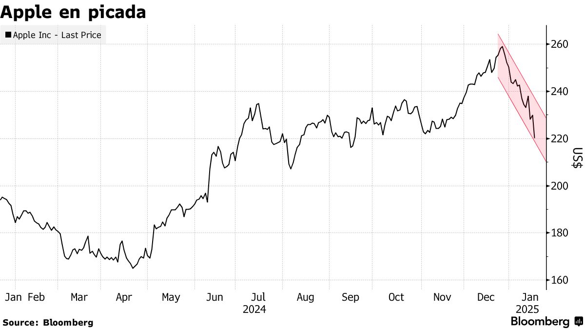 蘋果公司的股票在週二下跌了最多4.5%。截至本月,該股累計下跌12%,是自2022年12月以來一個月內的最大跌幅。