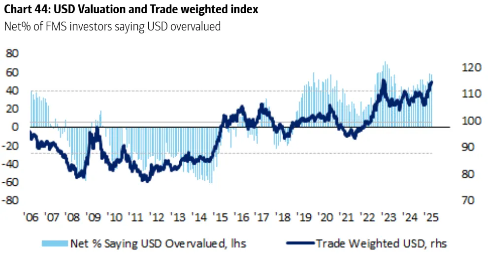 美元被高估,並在年初依賴特朗普2.0關税來維持其強勢。最新的美國銀行全球基金經理調查顯示,普遍認為美元被高估——並且與12月選舉後激增相比,樂觀情緒略有下降。這不可避免地使其對任何挑戰主流敍述的故事變得脆弱: