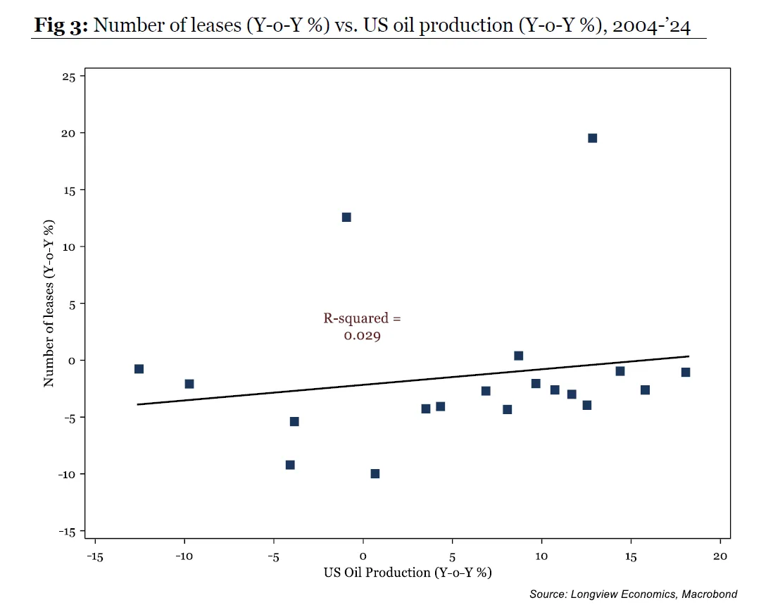 此外,令人好奇的是,進一步生產的激勵被視為一個明智的政策,而這個行業正受到供應過剩的困擾。朗維尤經濟學的哈里·科爾文補充道,推動美國石油生產顯著增長的因素是價格,而不是鑽探許可證。科爾文發現生產與租賃數量之間沒有相關性: