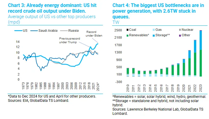 那麼,什麼構成了緊急聲明的基礎呢?Fan建議,新政府希望加快石油、天然氣和礦業項目的進程,但這很大程度上取決於細節。去年的最高法院裁決推翻所謂的Chevron尊重——一個政府監管機構應被賦予一定自由裁量權來解釋法規的先例——意味着對任何新的特朗普規則的法律挑戰成功的機會更大。這可能會阻礙更快的實施——並使政府依賴於司法專業知識。最後,她認為,石油生產商可能會看到額外的利潤,但並不是來自於增加的生產: