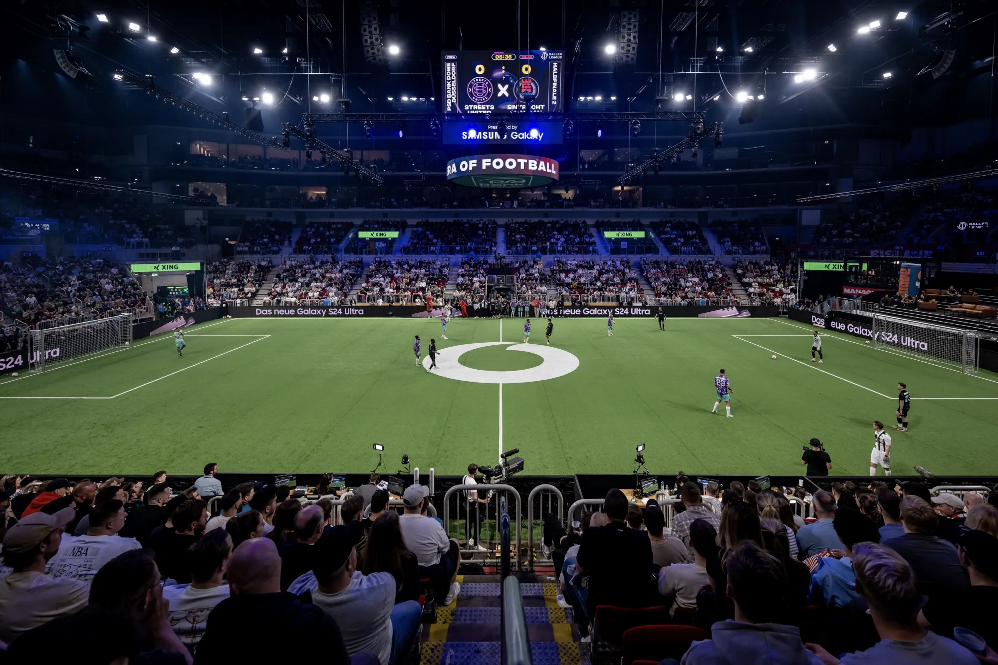 2024年4月在PSD銀行圓頂舉行的Baller League四強賽。攝影師:亞歷山大·舍伯爾/蓋蒂圖片社Baller League是一項由多位影響者和前足球運動員支持的六人制足球比賽,獲得了風險投資公司Apex和一組英超明星的新投資。