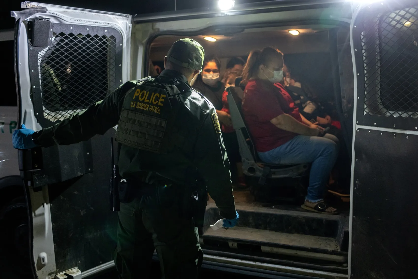 委內瑞拉移民在德爾里奧,德克薩斯州,越過里奧格蘭德後登上美國邊境巡邏車。