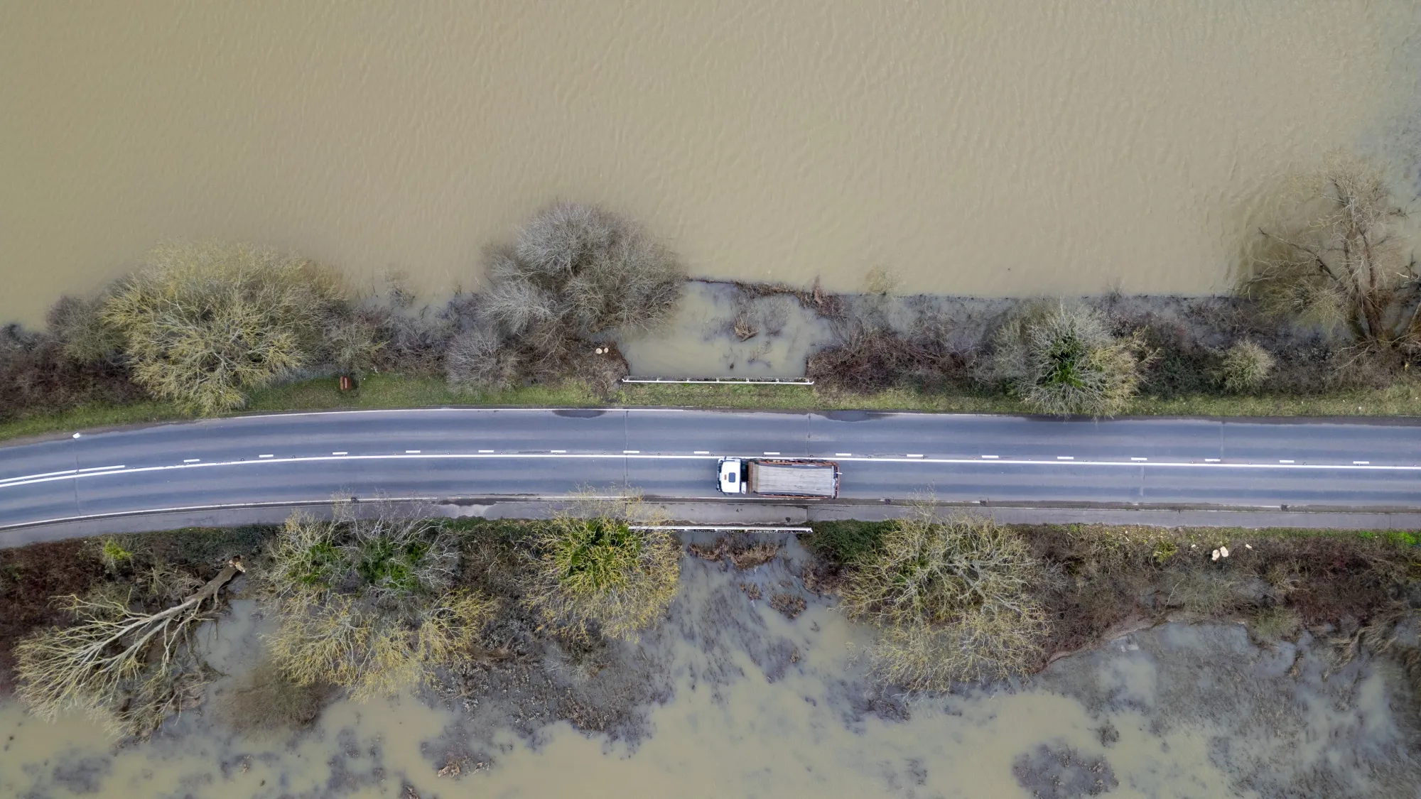 2024年1月8日,英國普爾伯勒,在風暴"漢克"帶來的強降雨導致阿倫河決堤後,一輛汽車在被洪水包圍的道路上行駛。