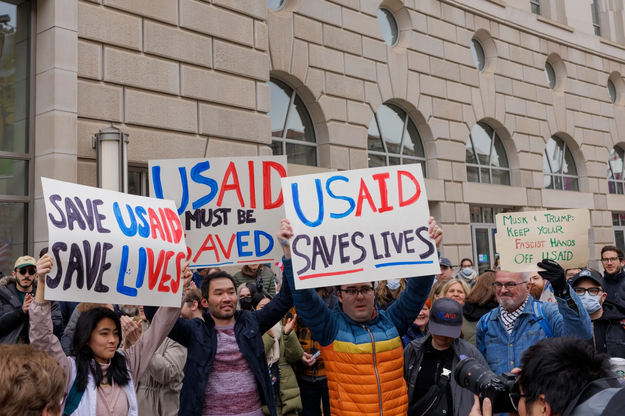 2月3日,美國國際開發署華盛頓總部外的抗議人羣。攝影師:Jason C. Andrew/Bloomberg週一,國務卿馬可·盧比奧宣佈已接管該機構,並警告國會議員稱運營評估後可能撤銷該部門。