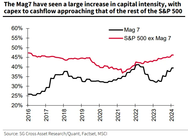 來源:法國興業銀行拉普索恩表示:“七巨頭"的資本支出"以美元計算過去四年翻番,去年增速達40%。而標普500其他成分股去年資本支出僅增長3.5%。“原因在於其餘493家企業現金流匱乏: