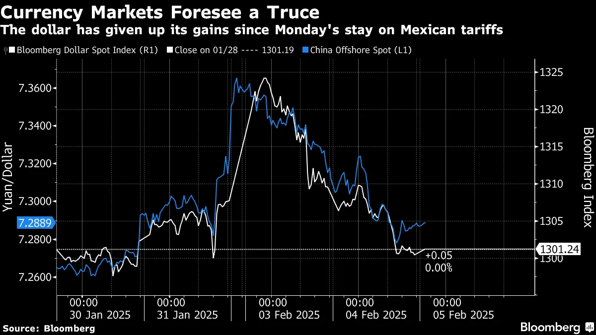 特朗普最初對所有來自北京的商品徵收10%關税——與他總統競選期間提出的更為激進的60%關税形成對比——以及中國隨後的反制措施,顯示出這兩個超級大國之間遠低於通常的“敵意”。針對約80種價值140億美元的美國產品的報復性關税要到2月10日才生效,而中國則增加了非關税措施,包括對谷歌進行反壟斷調查、加強對關鍵礦物的出口管制,以及將兩家美國公司列入其不可靠實體黑名單。這並非強有力的回應。再加上特朗普對墨西哥和加拿大的邊緣政策,最終以不徵收關税換取基本是象徵性的讓步而告終,這導致市場越來越有信心認為這場對抗很快就會結束。離岸人民幣和更廣泛的美元交易表明,特朗普的虛張聲勢正在被識破,上週五宣佈關税後出現的飆升現已完全逆轉: