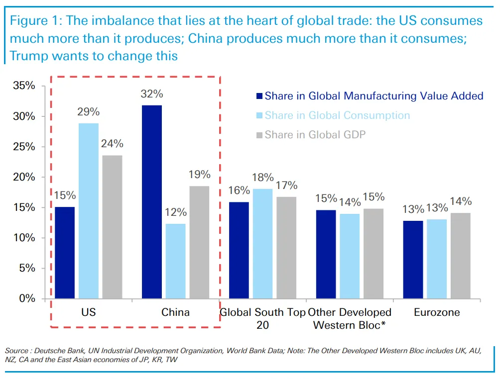 此外,德意志銀行的吉姆·裏德指出,儘管美國佔全球消費的29%,但其商品生產僅佔全球的15%。中國佔全球製造業的32%,而消費僅佔12%: