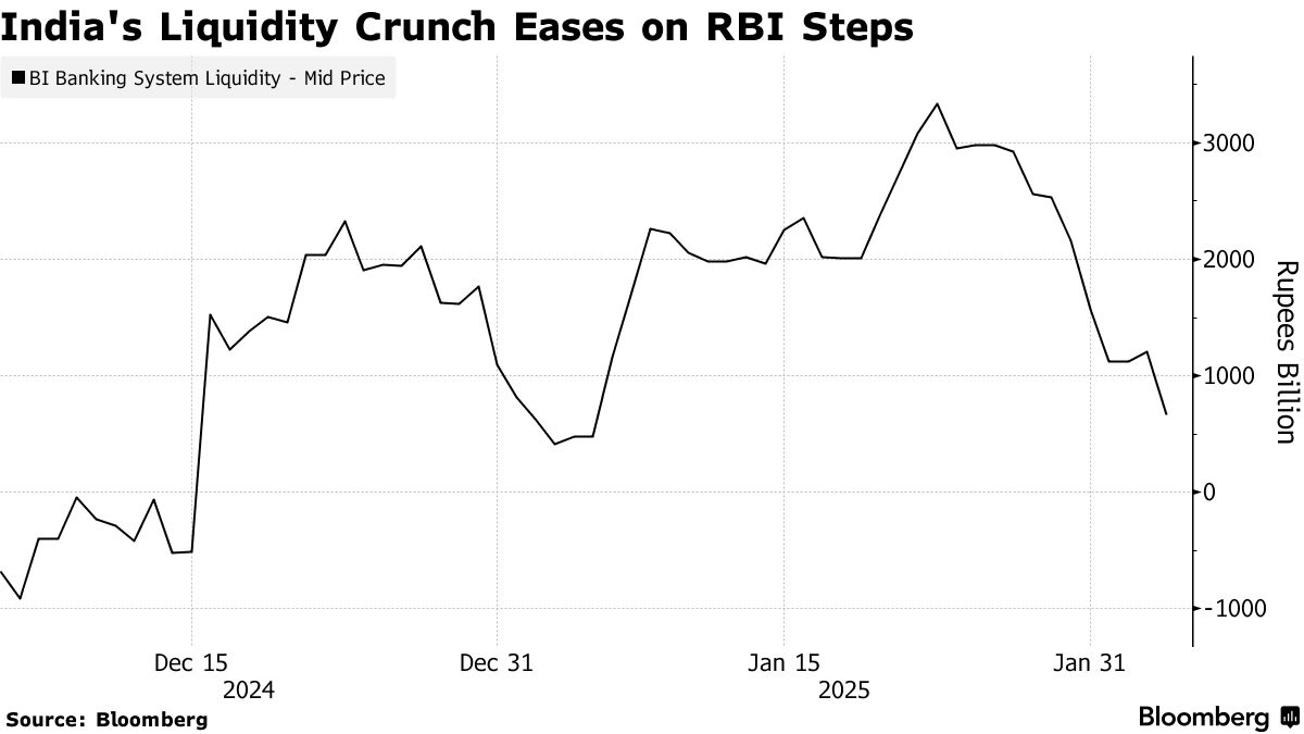 根據彭博經濟研究的一項指數,截至2月4日,流動性赤字(即銀行從印度央行借入的資金規模)為6640億盧比(76億美元),較1月30日的2.2萬億盧比顯著下降。