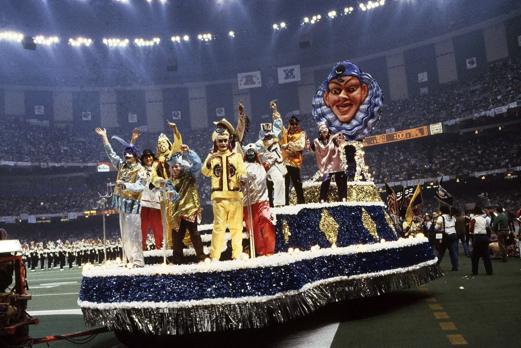 1981年超級碗XV中場秀中,一個以狂歡節為主題的花車在新奧爾良超級穹頂體育場亮相。攝影師:海因茨·克魯特邁爾/體育畫報自1975年首次啓用以來,新奧爾良超級穹頂體育場便成為重大橄欖球賽事的代名詞,每隔幾年就會舉辦一次超級碗。