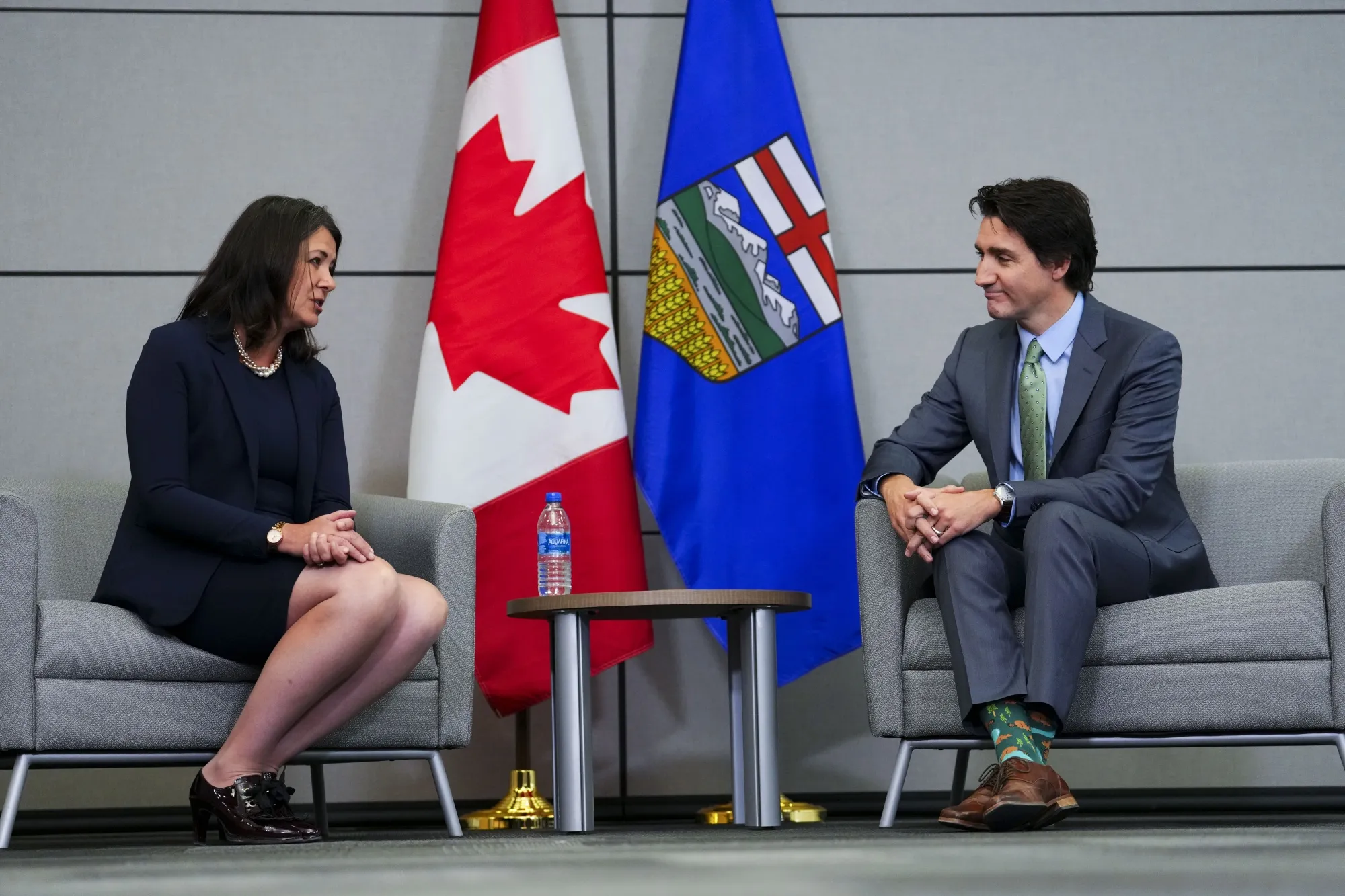 加拿大總理賈斯汀·特魯多與阿爾伯塔省長丹妮爾·史密斯。史密斯曾反對若特朗普對加拿大商品加徵關税就對石油徵收出口税,但新民意調查顯示其省民支持這一舉措。