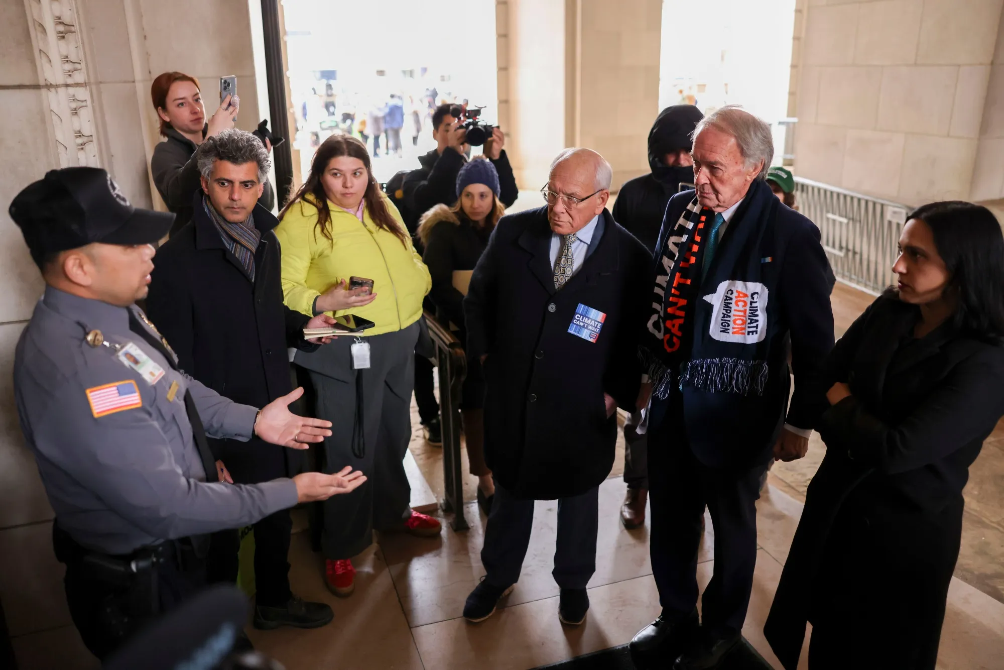 2月6日,眾議員保羅·通科、參議員埃德·馬基與眾議員亞薩明·安薩里試圖進入環保局總部。攝影師:蒂爾尼·L·克羅斯/彭博社此次抗議直指特朗普主政的環保局拒絕撥付國會通過前總統喬·拜登簽署的氣候法案為太陽能、清潔校車、水利設施等眾多項目劃撥的資金,儘管已有法院命令要求停止資金凍結。