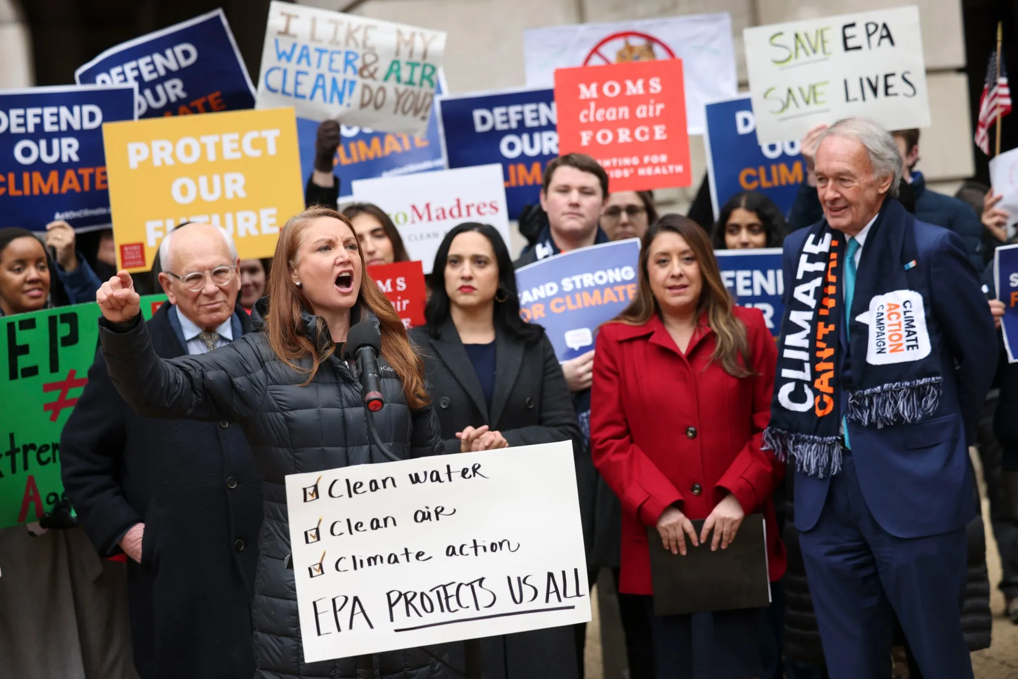 攝影師:蒂爾尼·L·克羅斯/彭博社週四,一批民主黨議員聚集在華盛頓環境保護局總部,譴責資金凍結行動。近日,勞工部、財政部等聯邦機構也發生了類似抗議活動。