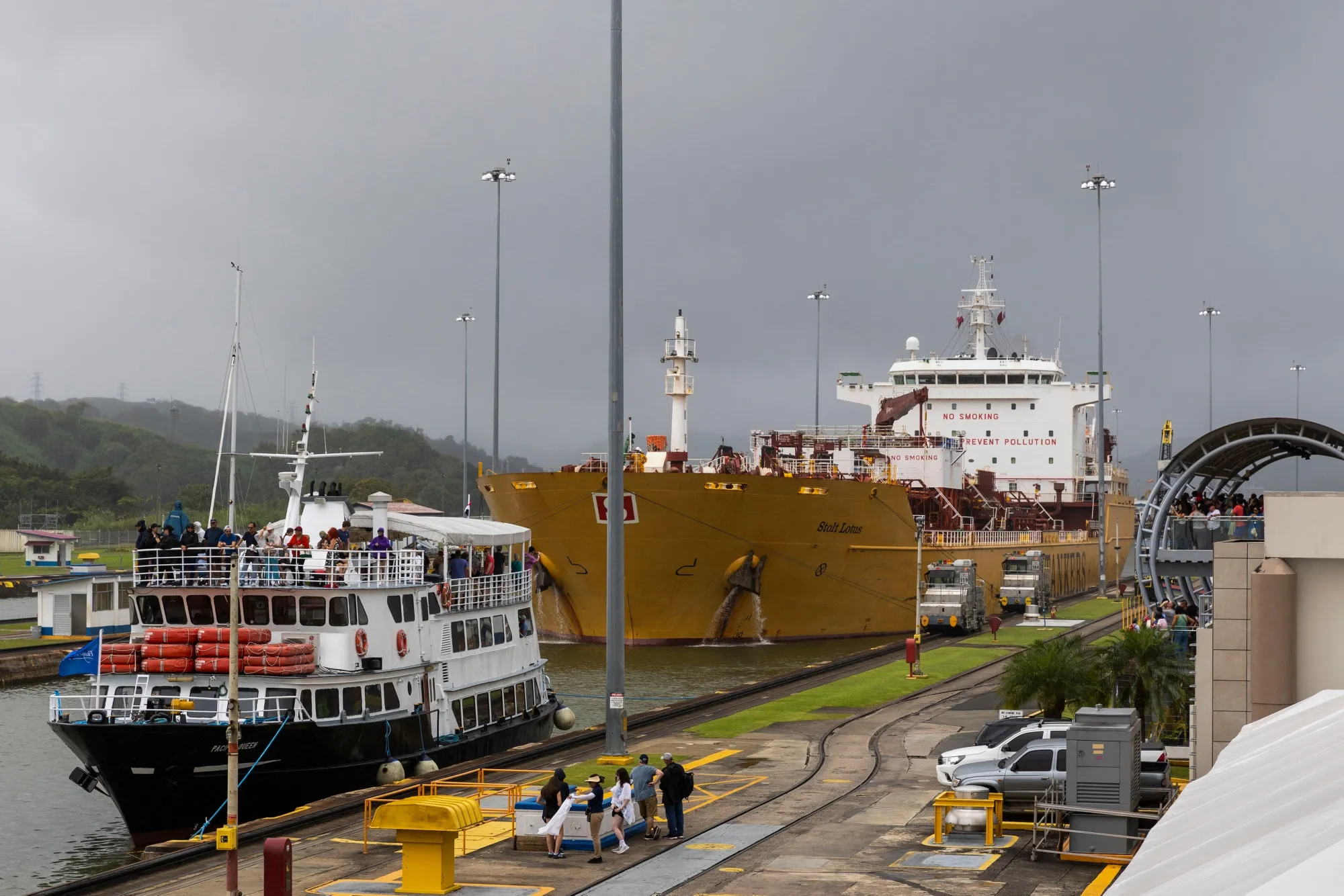 一艘客輪與一艘油輪正通過巴拿馬運河的米拉弗洛雷斯船閘。