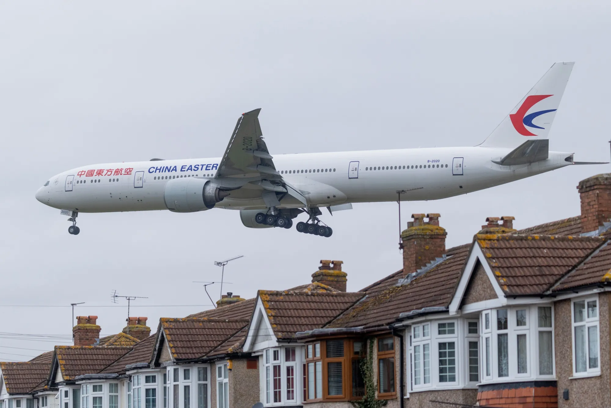 2025年2月3日,一架中國東方航空公司的客機降落在英國倫敦希思羅機場。攝影師:傑森·奧爾登/彭博社### 擴建希思羅機場是否符合英國的排放目標?