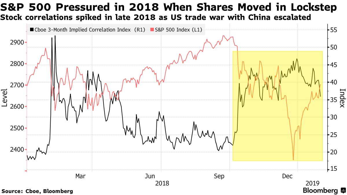諸如特朗普關税政策等宏觀風險,往往會導致股市整體波動。事實上,2018年末當對華貿易緊張局勢升級,疊加美聯儲利率政策路徑對股市的廣泛影響時,個股價格呈現出高度相關性。芝加哥交易所Cboe的三個月隱含相關性指數當時急劇攀升,標普500指數創下全球金融危機以來最差年度表現。