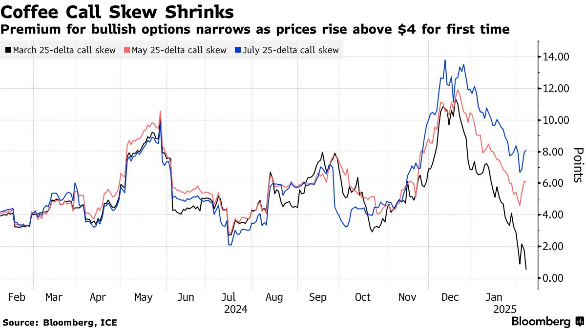 觀察其他大宗商品,全球天然氣交易活躍,芝商所集團亨利港期權交易量在1月創下歷史紀錄。紐約市場咖啡看漲和看跌期權未平倉合約量達到兩年多來最高水平,與此同時阿拉比卡咖啡期貨價格觸及歷史新高。有趣的是,儘管價格突破每磅4美元進入新高位區間,但看漲期權偏度自12月中旬以來持續收窄。
