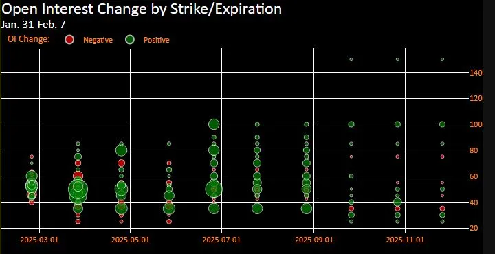 上週系列交易包括3000手7月80/100歐元看漲價差合約、700手7-9月60/70/80歐元看漲蝶式價差組合,以及另外3000手5月80歐元看漲期權。這種交易量在通常單筆200手左右的市場上實屬罕見。上週看漲期權未平倉合約總量創下峯值,而看跌期權未平倉合約自11月高點持續回落。
