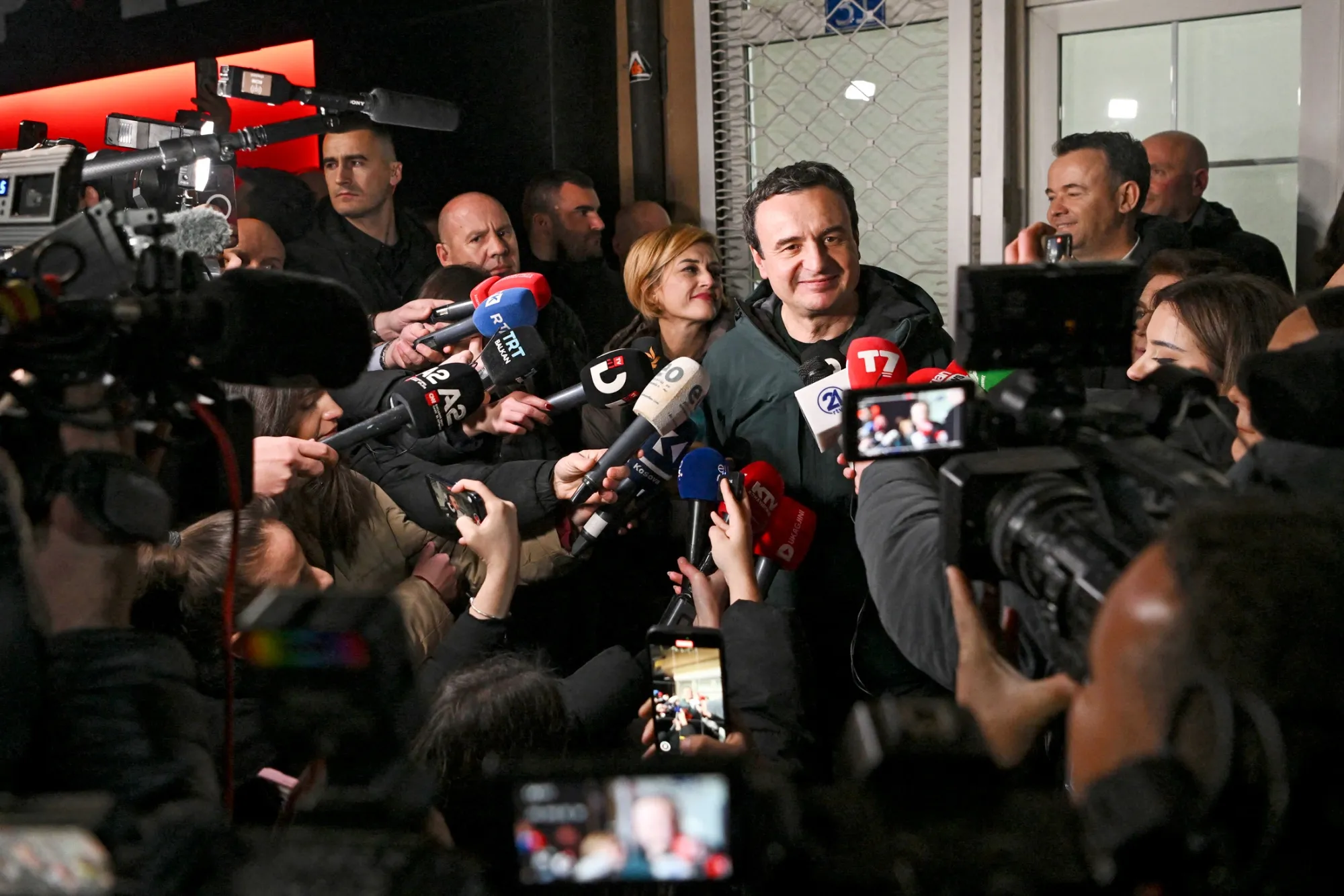 2月9日,阿爾賓·庫爾蒂在其政黨位於普裏什蒂納的總部外。攝影師:Armend Nimani/AFP/Getty Images在週一凌晨的集會上,庫爾蒂幾乎沒有表現出與科索沃主要反對黨接觸的意願。