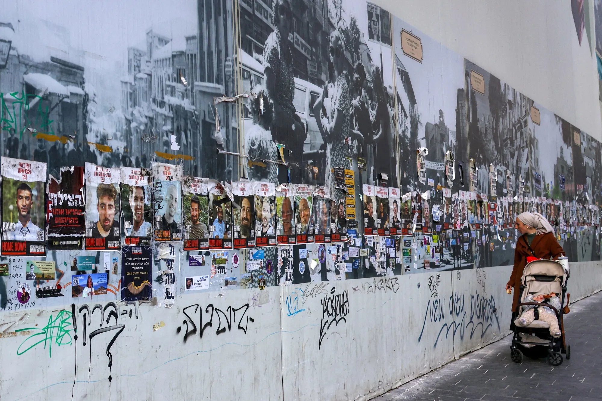 一名推着嬰兒車的婦女正在觀看描繪加沙被俘以色列人質的海報。
