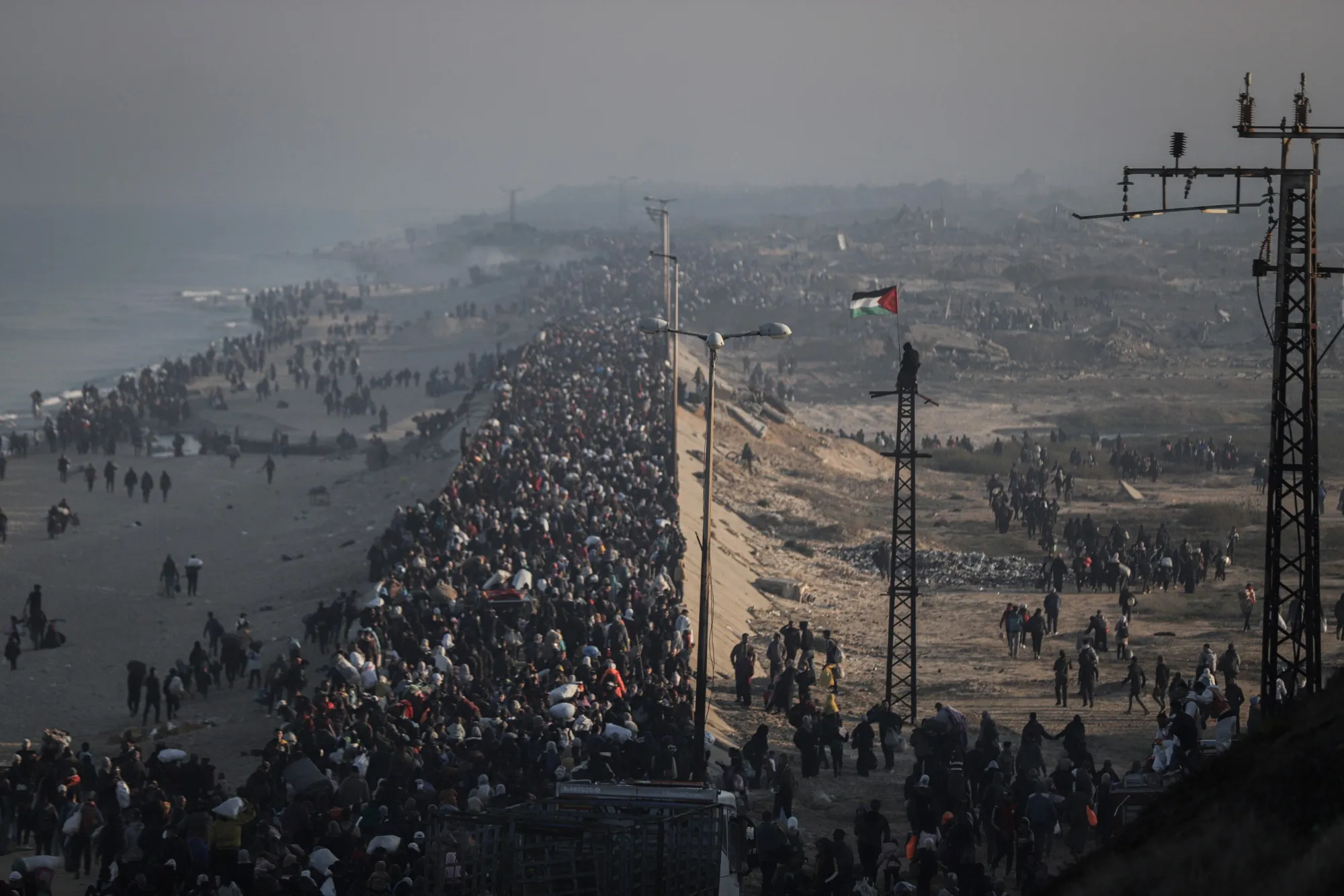 1月27日停火期間,數千名流離失所的巴勒斯坦人沿着加沙中部海岸返回加沙北部的家園。