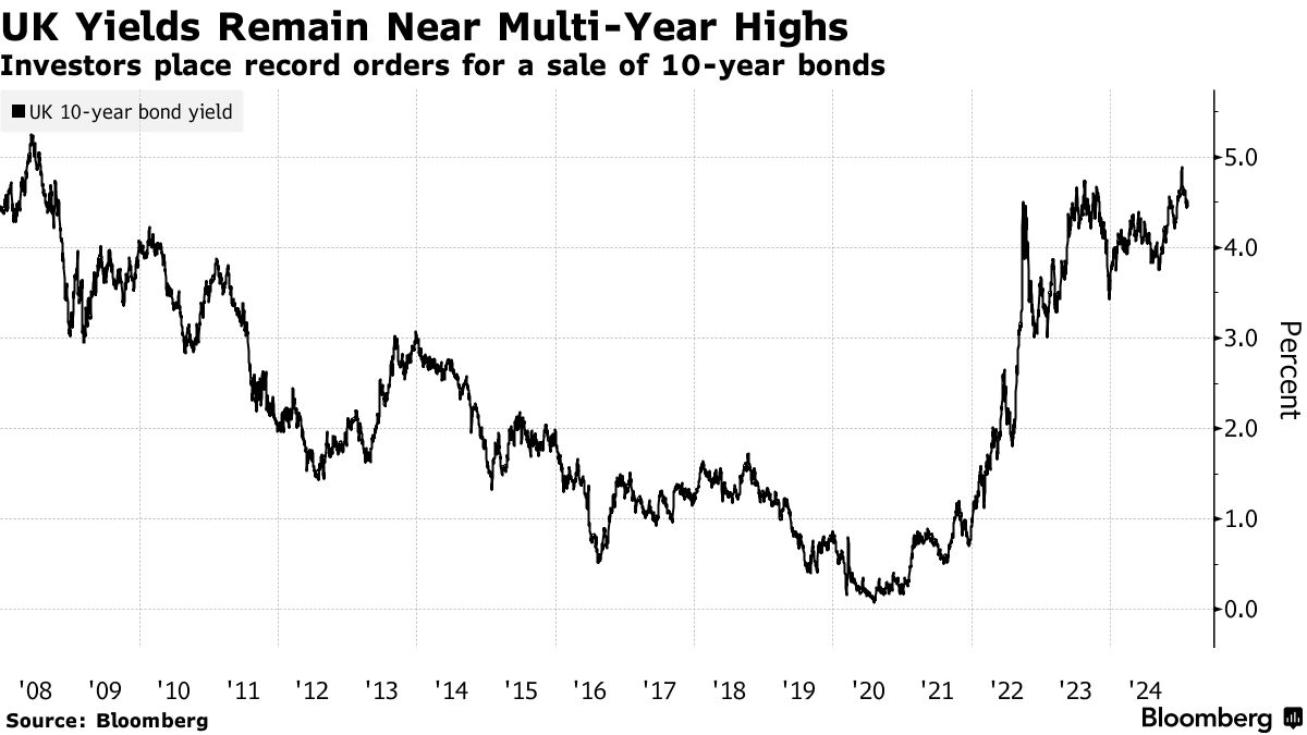 上月英國十年期國債收益率一度升至近5%,因財政大臣雷切爾·裏夫斯在10月預算案中宣佈大規模發債計劃為政府支出籌資,投資者對消化鉅額債券供應望而卻步。此後收益率回落,週二交投於4.50%左右。