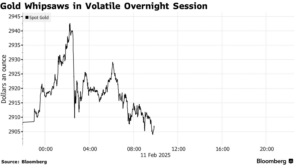 金價一度飆升至每盎司2942美元上方的新峯值,隨後回落。週一,在唐納德·特朗普總統對進口鋼鐵和鋁徵收關税、加劇全球市場不確定性後,金價首次突破2900美元。他還警告稱,關税"可能會進一步提高"。