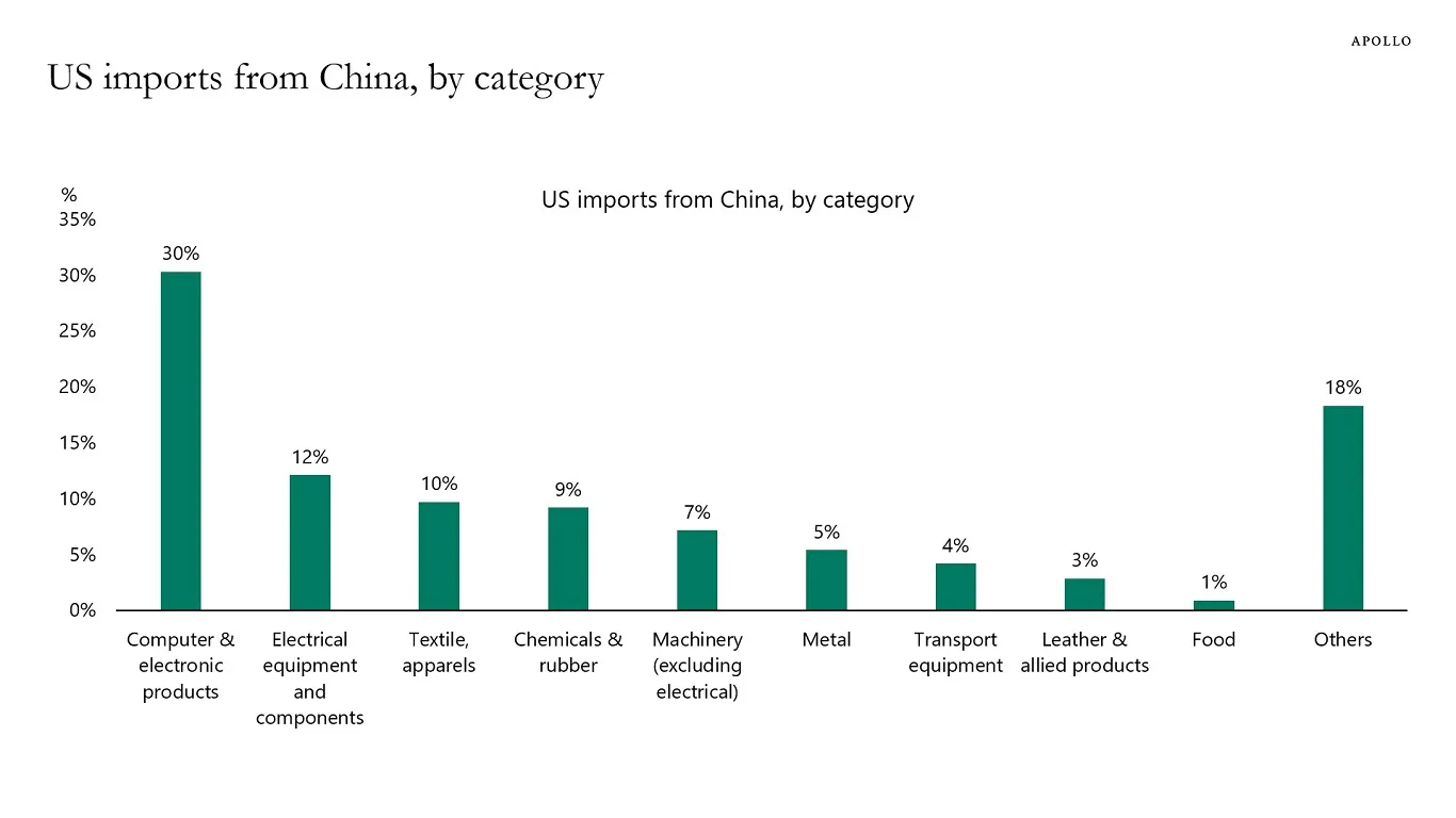 加拿大是美國精煉鋁最大進口來源國,若特朗普政策不反轉將受衝擊最重。對中國影響可能較為有限,因其對美金屬出口量顯著較低。正如阿波羅全球管理公司圖表所示,當前中國對美出口以電子和計算機產品為主導: