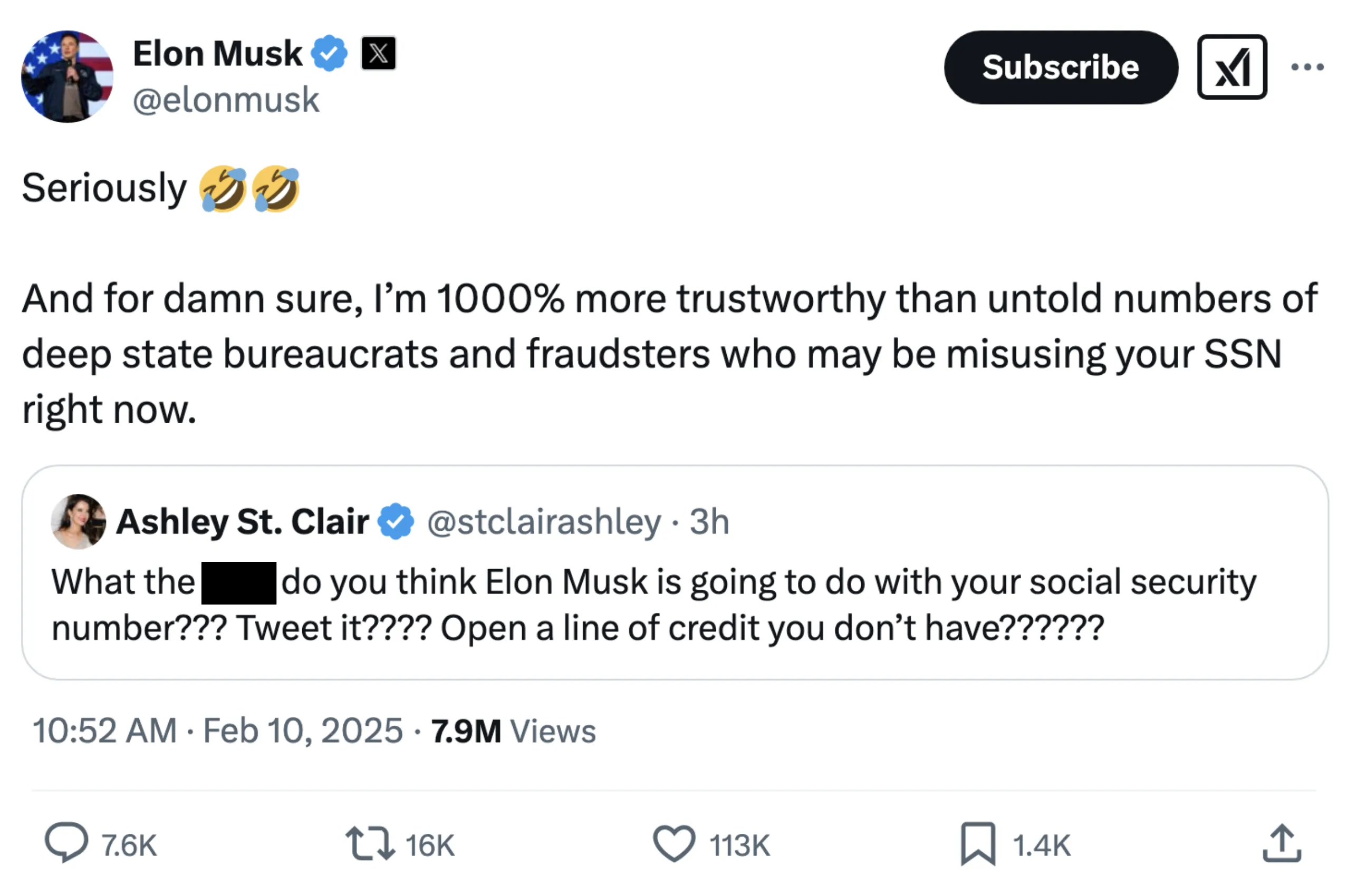 社會保障管理局成為DOGE的瞄準目標已不是什麼秘密。西弗吉尼亞州國會議員萊利·摩爾今早在福克斯商業頻道上談論了削減“強制性支出”的問題,而在過去大約24小時內,埃隆·馬斯克已經發推至少六次提到“社會保障欺詐”。1這一切讓唐納德·特朗普總統處於一個相當尷尬的位置,他上週五表示“社會保障不會被觸及”。