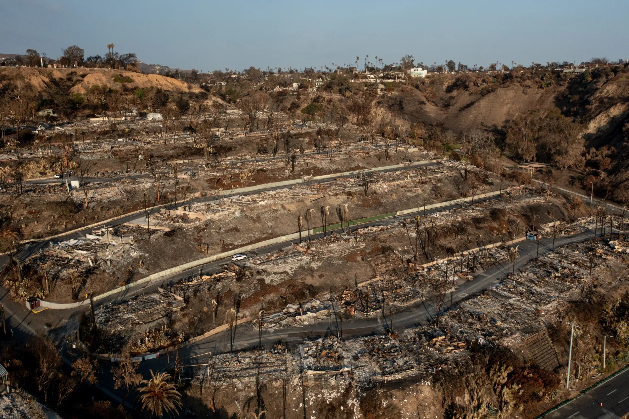 1月30日,洛杉磯太平洋帕利塞德地區帕利塞德大火後,太平洋帕利塞德碗移動房屋公園被毀的房屋。