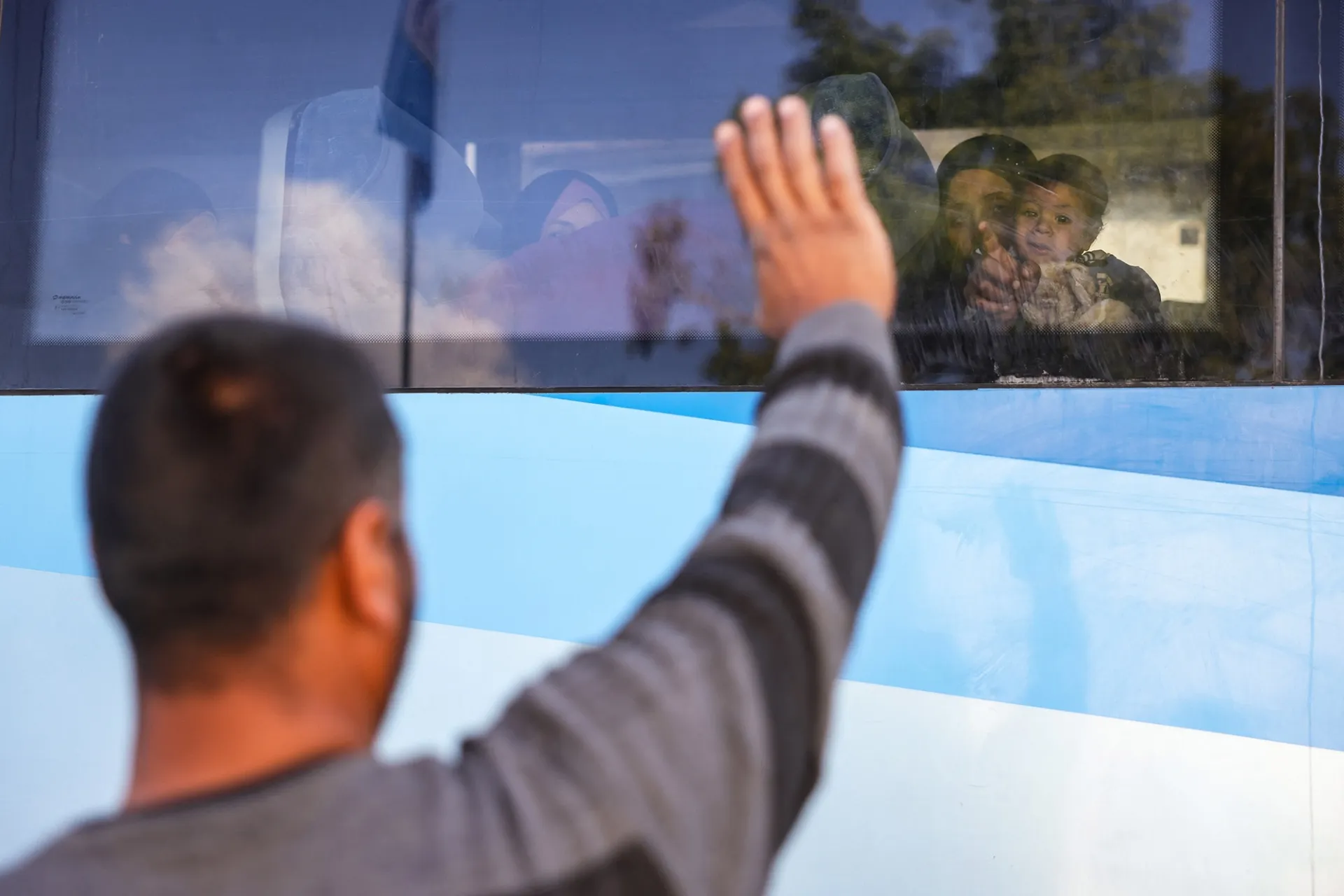 2月1日,加沙城希法醫院的病患等待通過拉法口岸撤離治療時,一名男子向坐在巴士上的妻兒揮手告別。攝影師:Bashar Taleb/AFP/Getty Images會議開始時,阿卜杜拉表示將盡快將那些癌症患兒或"病情危重"的兒童轉移至約旦。