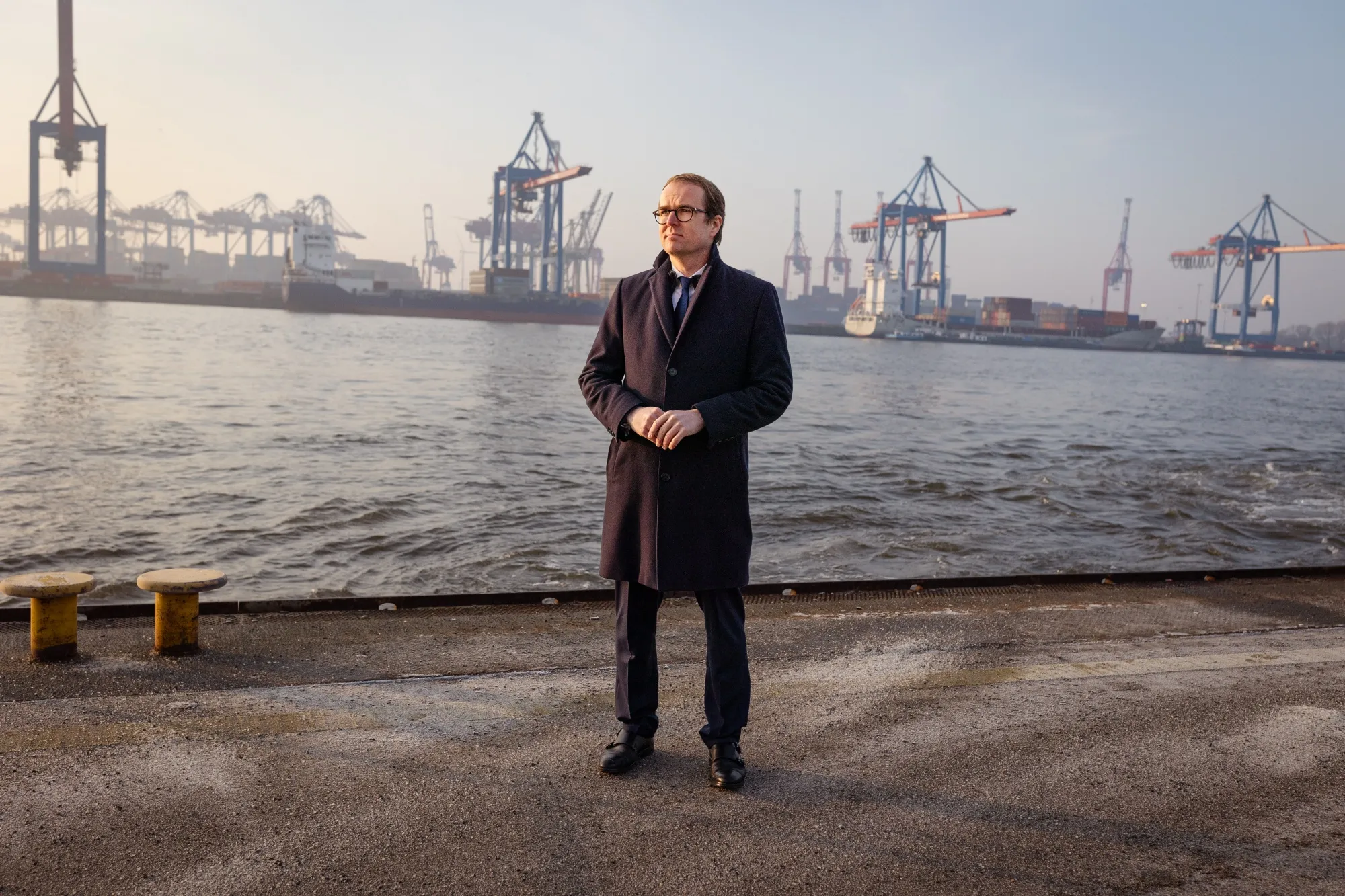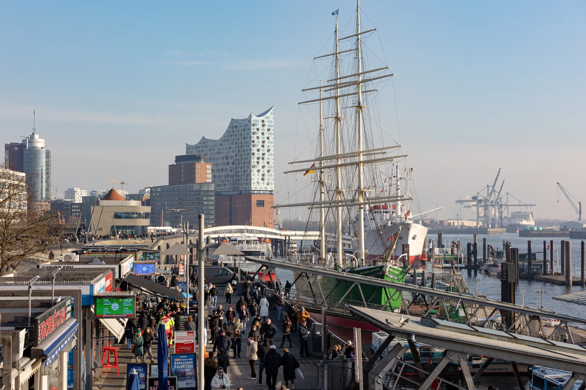 駛往斯堪的納維亞和波羅的海港口的貨輪在此裝卸,偶爾有更龐大的集裝箱船駛向100公里(62英里)外的北海,其掀起的巨浪拍打着堤岸。在布洛姆+福斯造船廠,兩艘德國海軍大型艦艇和一艘豪華超級遊艇正進行最後的建造或舾裝作業。