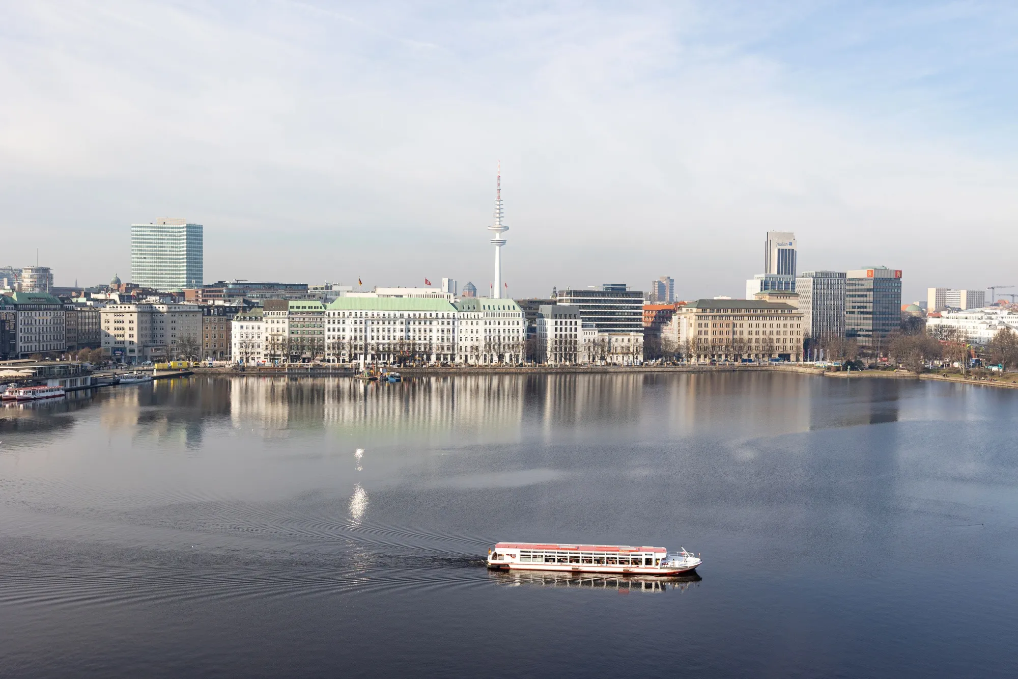 從赫伯羅特大廈俯瞰阿爾斯特湖與漢堡市中心,這座因全球貿易而繁榮的都市財富盡收眼底。攝影師:瑪麗亞·費克"德國正試圖在世界中找到自己的位置,“德國馬歇爾基金會的戴維-威爾普表示,“它被稱為出口強國,其聲譽和實力建立在全球化與開放貿易市場之上——但這種模式目前已不合時宜。”
