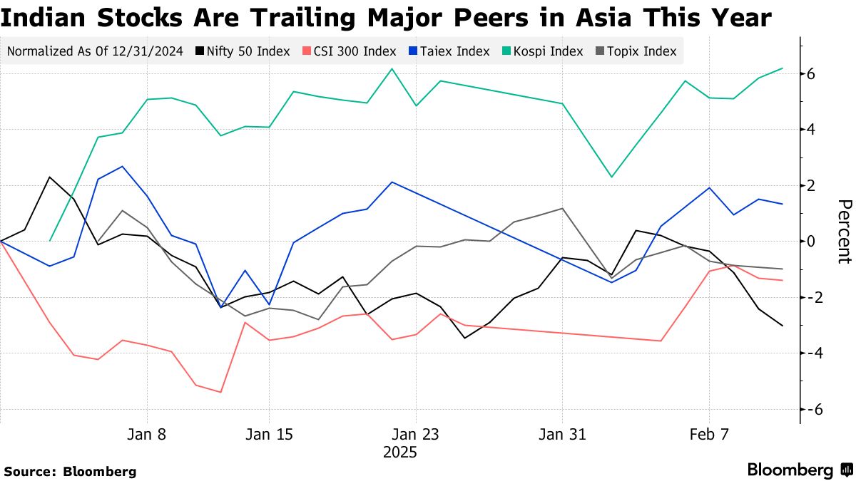 莫迪此次訪問之際,自9月底以來外國投資者已從印度股市撤資210億美元,盧比跌至新低,印度4.1萬億美元的股市今年在亞洲主要經濟體中表現最差。特朗普威脅要實施對等關税,這隻會讓情況變得更糟。