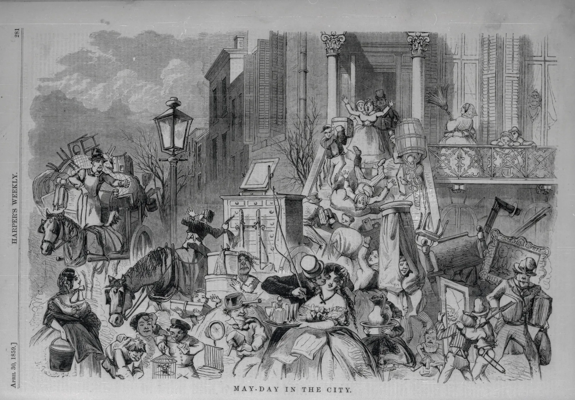 搬家日——這個一年一度的流動慶典——在不同地方有着不同的日期。所有未書面續簽的租約都在同一天到期,整座城市可能有一半人都在忙着搬遷。我最喜歡的一個軼事是,人們會在搬家日拉上家中窗簾假裝不在,因為他們對留在原地感到難為情。當時存在着濃厚的流動文化。當然,文化會變遷,且往往難以復現。