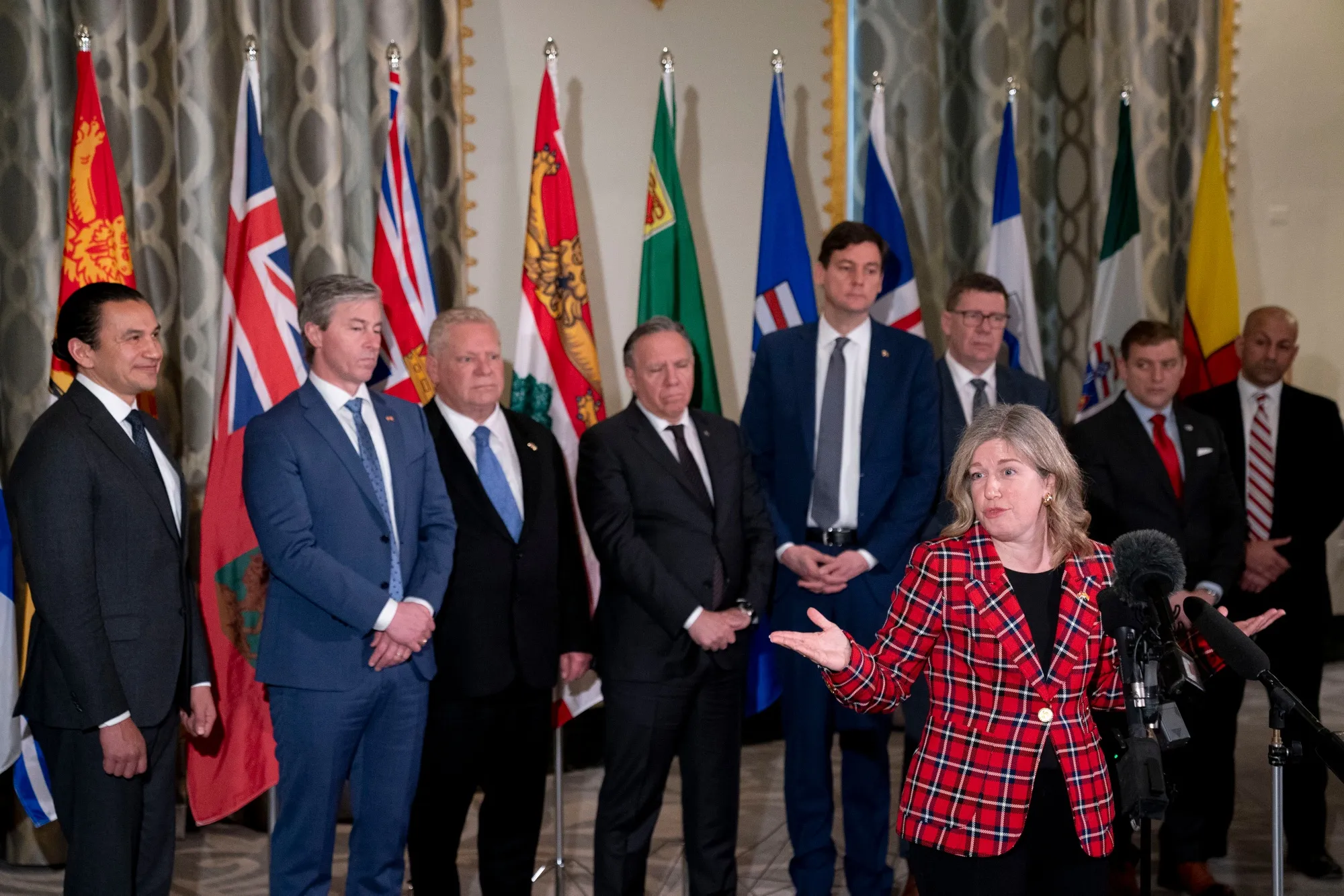 新不倫瑞克省省長蘇珊·霍爾特週三在華盛頓記者會上發言。攝影師:斯特凡尼·雷諾茲/彭博社並非所有省長都出席了下午與白宮副幕僚長詹姆斯·布萊爾及總統人事辦公室主任塞爾吉奧·戈爾的會議。