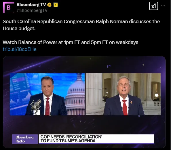 今天下午1點,彭博電視台《權力平衡》早間版節目中,主持人喬·馬修和凱莉·萊茵茨採訪了南卡羅來納州共和黨眾議員拉爾夫·諾曼,討論眾議院預算問題。