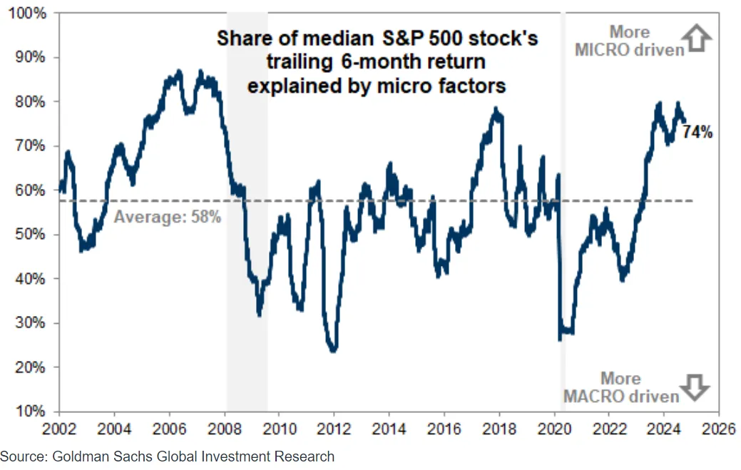 高盛集團分析顯示,自2023年初以來市場受微觀因素驅動的程度高於歷史平均水平。過去六個月中,標普500成分股74%的回報由公司特定因素(而非"宏觀"因素)驅動,而過去二十年平均比例為58%。