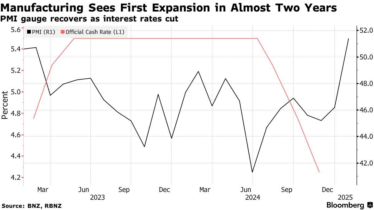 “2025年開局良好,製造業正從倒車檔換入一檔,”BNZ銀行高級經濟學家道格·斯蒂爾表示。“儘管採購經理人指數仍低於52.5的長期平均值,但經過極具挑戰性的兩年後,這一改善對製造商而言是值得歡迎的好消息。”