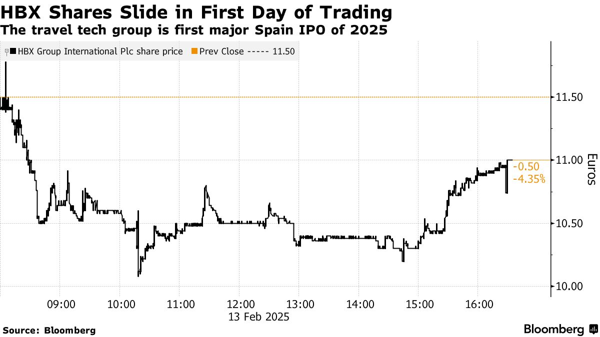 西班牙旅遊科技公司HBX集團國際股份有限公司的股票在週四首日交易中下跌,標誌着今年歐洲最大規模IPO開局不順。