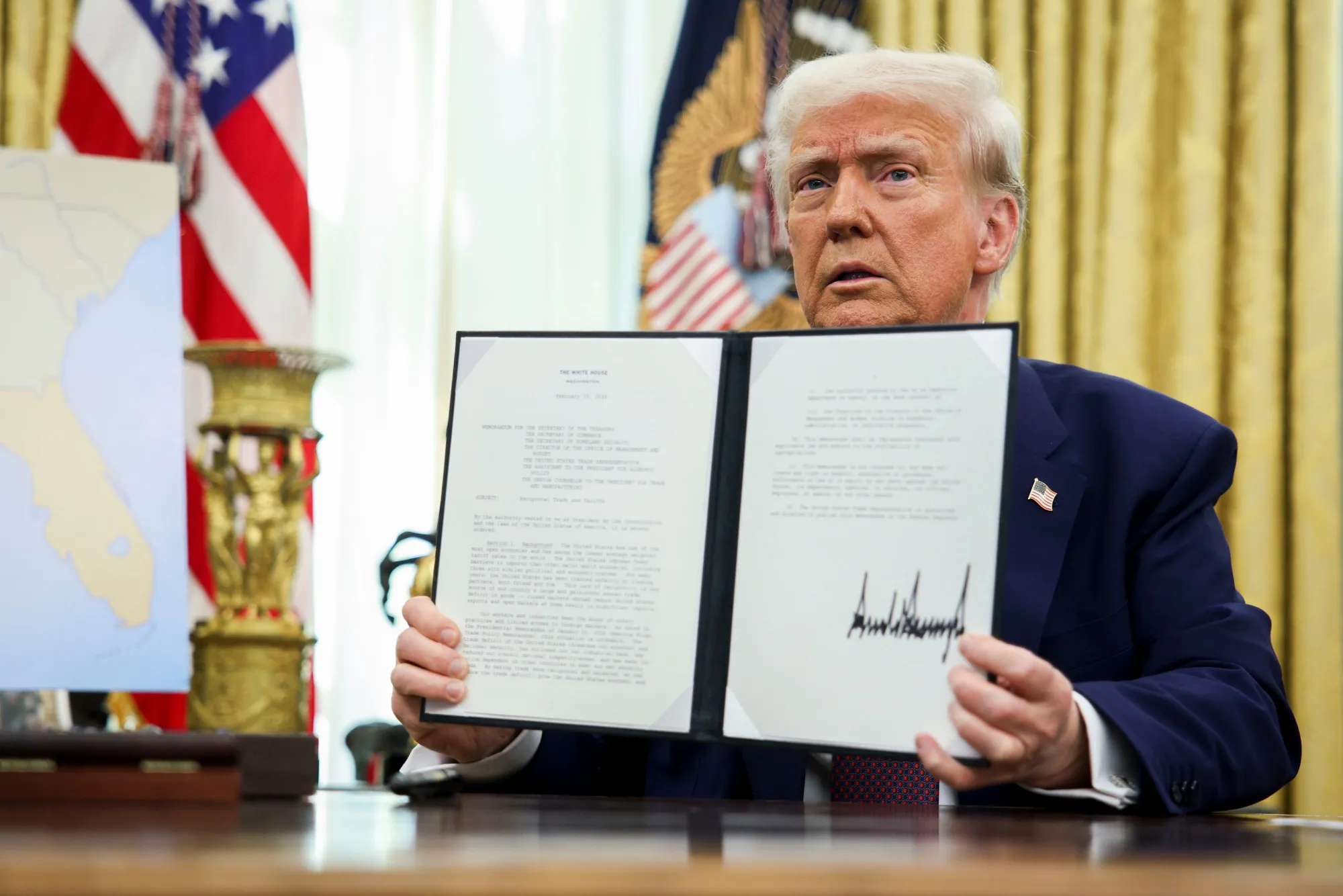 2月13日,特朗普在白宮橢圓形辦公室展示簽署的行政令。攝影師:Francis Chung/Politico/Bloomberg在特朗普週四宣佈決定"對任何國家向美利堅合眾國徵收的關税實施對等反制"後,避免對等關税可能更加困難。
