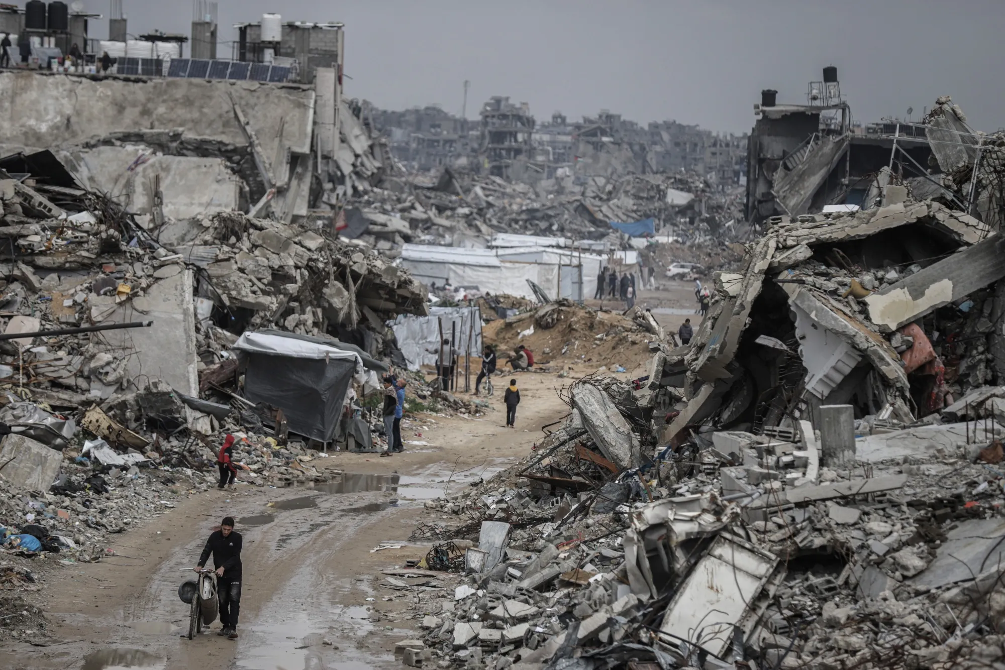 2月13日,流離失所的巴勒斯坦人聚集在加沙北部賈巴利亞難民營的廢墟中。攝影師:艾哈邁德·薩利姆/彭博社儘管盧比奧聲稱阿拉伯國家缺乏方案,稱特朗普的新構想是唯一現存方案,但該地區長期以來一直希望通過建立獨立的巴勒斯坦國來解決衝突。