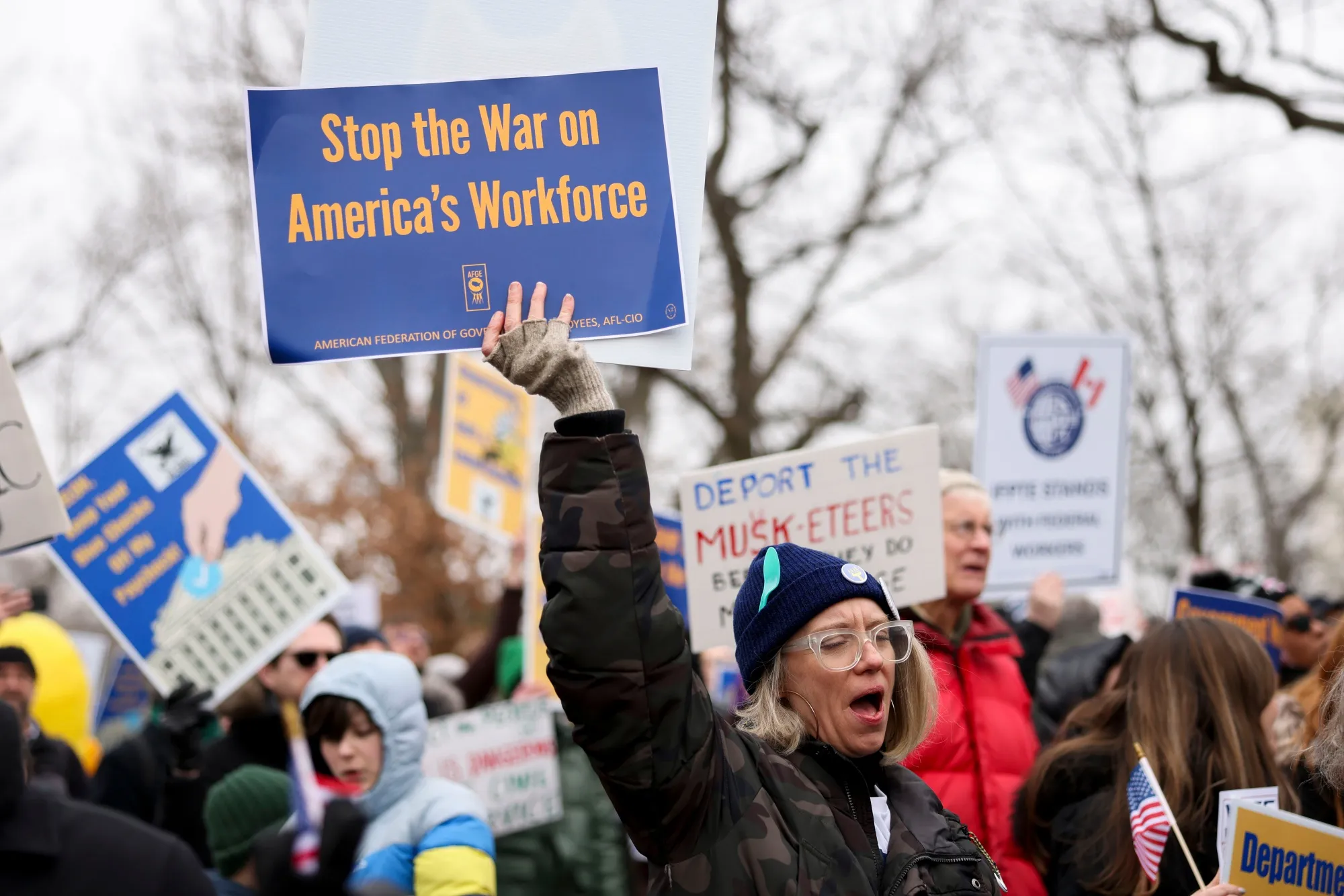 華盛頓特區的聯邦工作人員集會上,示威者高舉標語牌。攝影師:蒂爾尼·L·克羅斯/彭博社倡導團體和民主黨籍州檢察長們拒絕公開討論他們針對特朗普政府的訴訟選址策略。已發起多起訴訟的"民主前進"組織首席執行官斯凱·佩裏曼指出,目前不同法院及巡回法庭的裁決結果差異顯著。