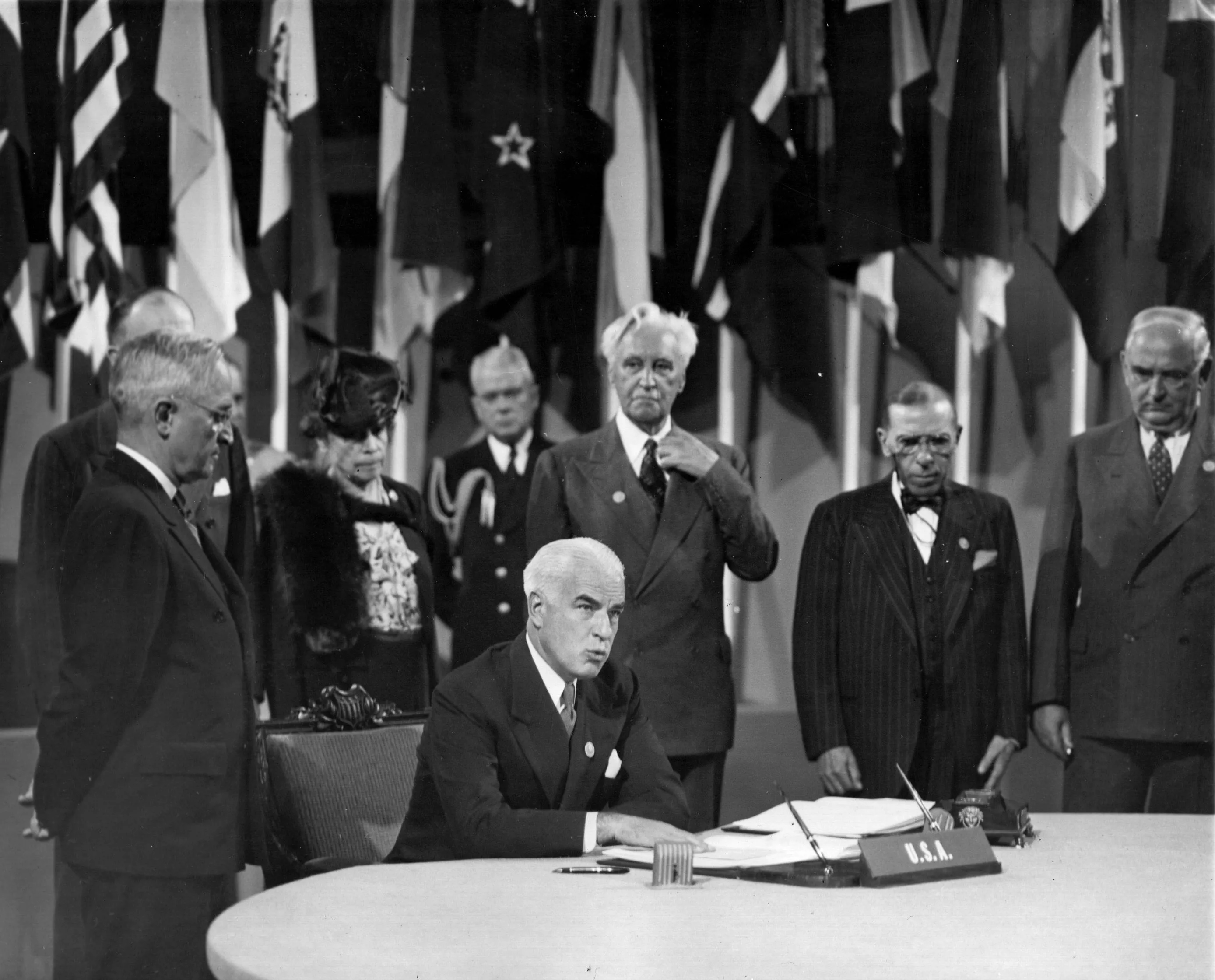 哈里·杜魯門(左)注視着國務卿愛德華·斯退丁紐斯簽署《聯合國憲章》。圖片來源:Keystone/Hulton Archive/Getty Images1945年後美國參與的每場重大沖突——朝鮮戰爭、越南戰爭和波斯灣戰爭——都有其特定動機,從遏制亞洲共產主義到保障石油供應。但每次干預行動都植根於對更深層準則的捍衞。