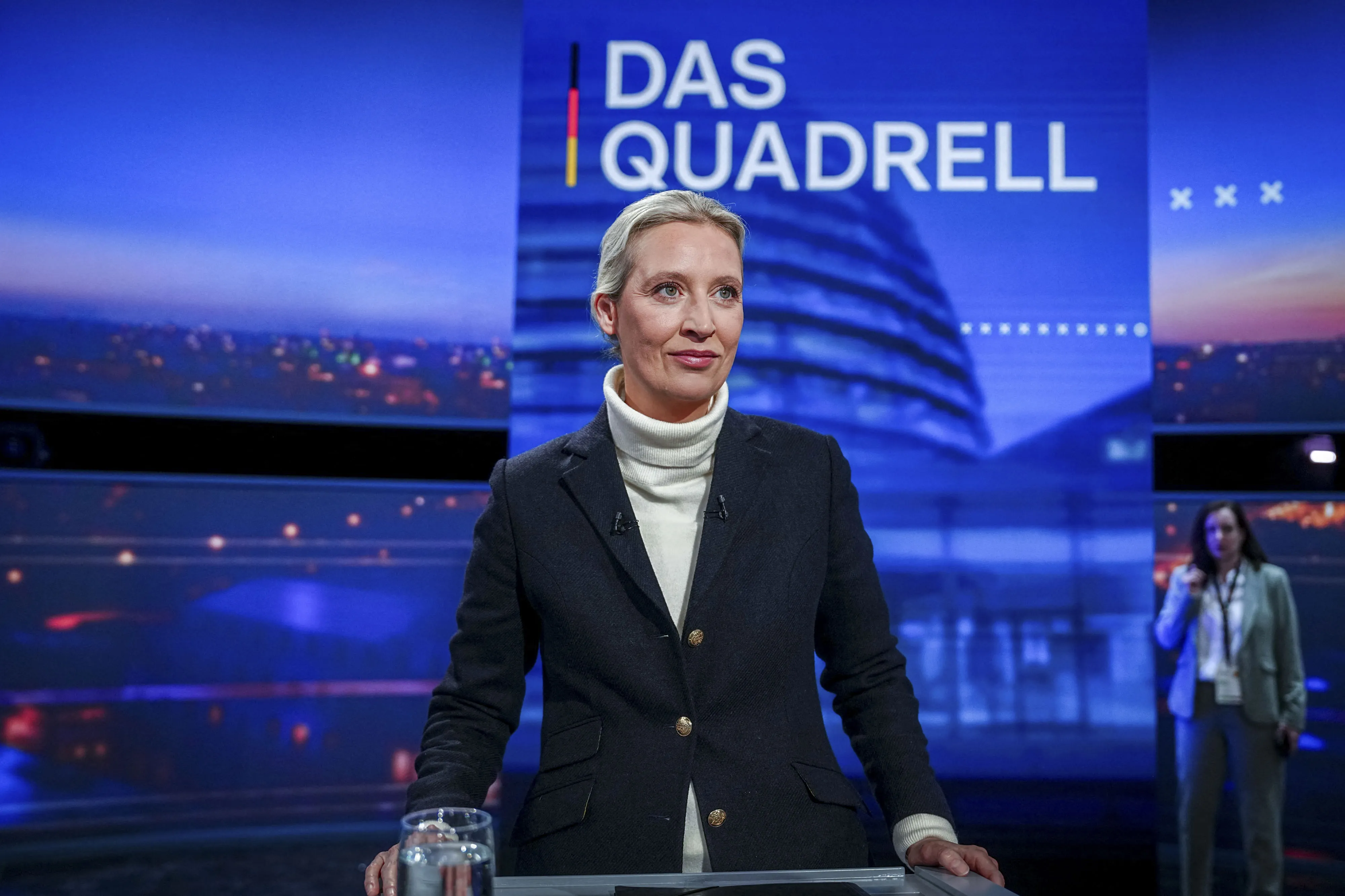 2月16日,艾莉絲·魏德爾在柏林參加電視辯論。攝影師:凱·尼特菲爾德/法新社/蓋蒂圖片社"你關於赫克先生的言論——德國每個男女都可以毫無顧忌地稱他為納粹,而你卻想讓他進入你的內閣——這顯示了你的為人,“梅爾茨説。